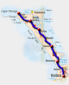 Auf zum Cape Reinga! Die geführte Tour ging zunä- chst durch einen riesigen Kauri-Forest, den Aupouri Wald. Der Kauri ist eine spezielle Baumart und be- sitzt in seinen Wurzeln den wertvollen Kaurigum. Die ersten Einwanderer rohdeden ganze Wälder ab um an den damals be- gehrten Rohstoff zu kom- men. Er wurde für die Herstellung von Farben und im Schiffsbau ver- wendet. Die Spuren der Ausbeutung sind heute noch zum Teil erkennbar.