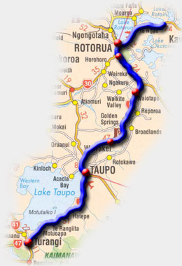 Heute hatten wir ein volles Programm um von Rotorua bis nach Taupo zu gelang- en. Zunächst besuchten wir in unmittelbarer Nähe von Rotorua das geothermale Gebiet "Hells Gate". Weiter ging es zum Burried Village und zum Thermaldorf Wha- karewarewa. Auf dem Weg bis nach Taupo befinden sich einige geothermale Ge- biete, die man gegen gerin- gen Eintritt entweder selbst oder mit einer Führung er- kunden kann. Etappenziel war an diesem Tag Turangi.